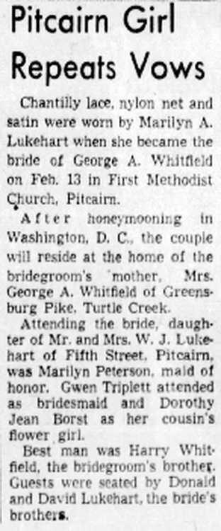 Attending the bride, daughter of Mr. and Mrs. W. J. Lukehart of Fifth Street, Pitcairn, was Marilyn Peterson, maid of honor. Gwen Triplett attended as bridesmaid and Dorothy Jean Borst as her cousin's flower girl. Best man was Harry Whitfield, the bridegroom's brother. Guests were seated by Donald and David Lukehart, the bride's