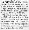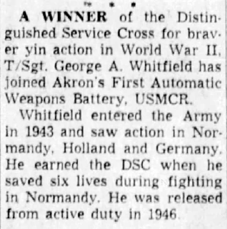 Weapons Battery, USMCR. Whitfield entered the Army in 1943 and saw action in Normandy, Normandy, Holland and Germany. He earned the DSC when he saved six lives during fighting in Normandy. He was released from active duty in 1946