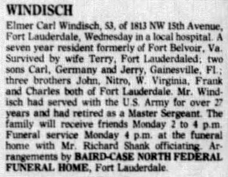 Charles both of Fort Lauderdale Mr. Windisch had served with the U.S.. Army for over 27 years and had retired as a Master Sergeant The family will receive