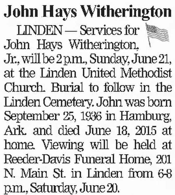 LINDEN ... Services for John Hays Witherington,
