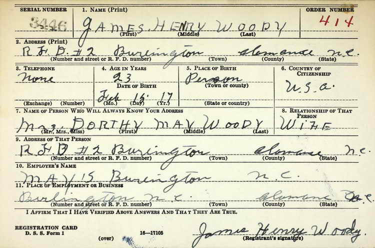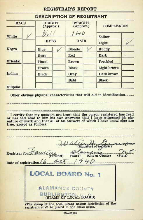 Burlington, NC on 16 October 1940 and ws inducted into the Army at Fort