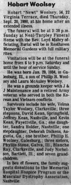 Survivors include his wife, Velma Taylor Woolsey, Clarksville; three stepsons, David Kean, Springfield, Jeffrey Kean, Nashville, and Kevin Kean,