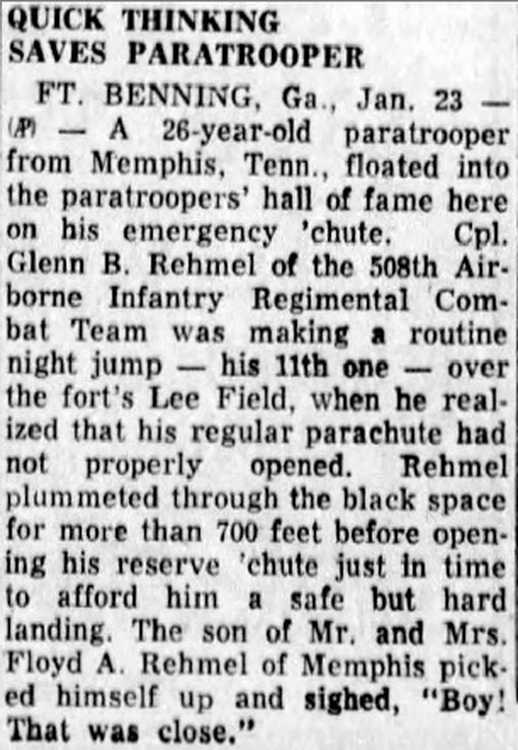 Cpl Glenn B. Rehmel had a chute malfunction when he jumped over