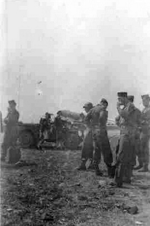 a group of men, probably Service Company, stand near a vehicle with C-47