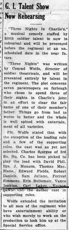 Charlie's,” a musical comedy staffed by 508th soldier talent is now in