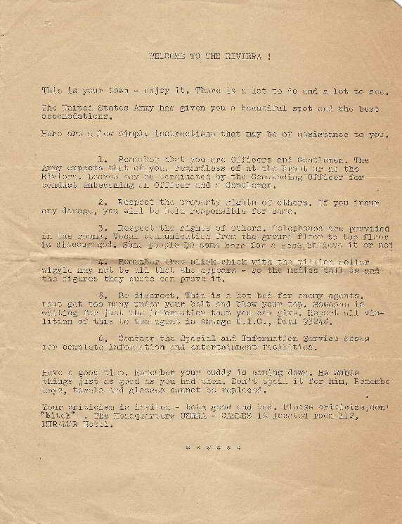 Your criticism is invited – both good and bad. Please criticize, not “bitch.” The Headquarters USFET – CANNES is located [in] room 112, MIRAMAR HOTEL.