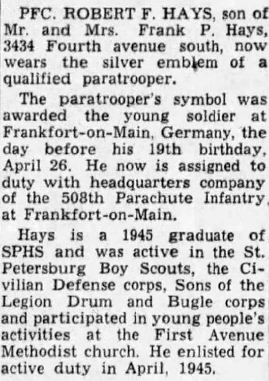 PFC ROBERT F. HAYS, son of Mr. and Mrs. Frank P.