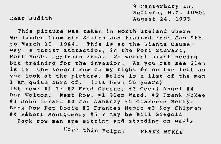This photo was sent to Pvt Glenn Ward's daughter by Frank McKee in August 1993. An enclosed note (shown at