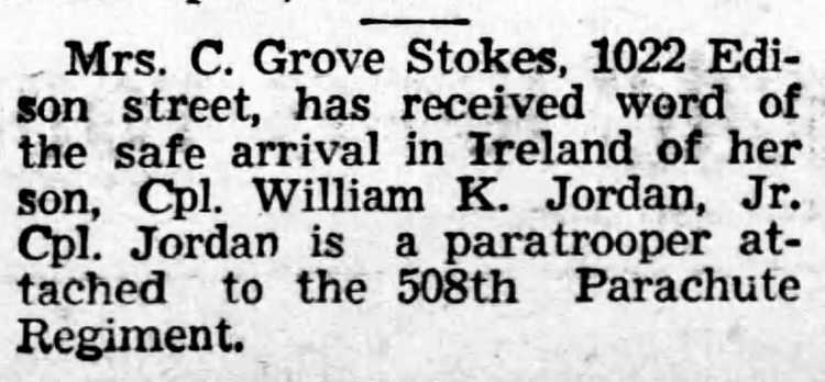 safe arrival in Northern Ireland of her son, Cpl William K. Jordan, Jr.