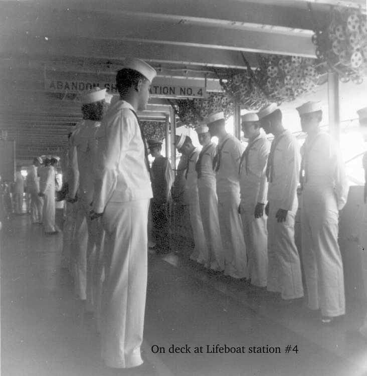 ship's crew prepares for abandon ship drill |