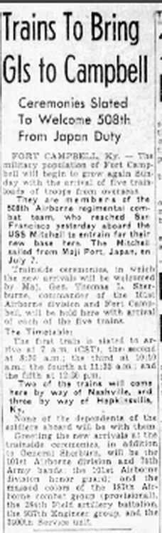 here. The Mitchell sailed from Moji Port, Japan, on July 7. Trainside ceremonies, in which the new arrivals will be welcomed by Maj. Gen. Thomas L. Sherburne, commander of the 101st Airborne division and Fort Campbell, will be held here with arrivals of each of the five trains.