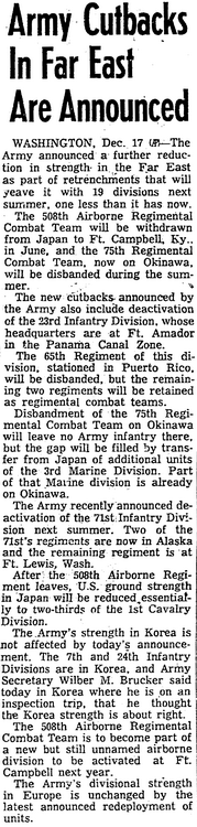 The 508th Airborne Regimental Combat Team will be withdrawn from Japan to Ft. Campbell, Ky.. in June, and the 75th Regimental Combat Team, now on Okinawa, will be disbanded during the
