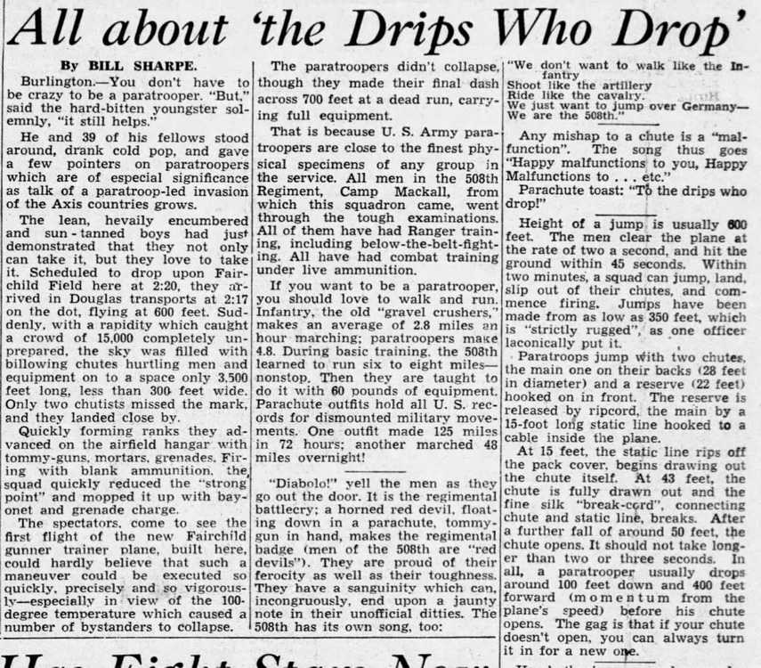 He and 39 of his fellows stood around, drank cold pop and gave a few pointers on paratroopers which are of especial significance as talk of a paratroop-led invasion of the Axis countries grows