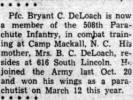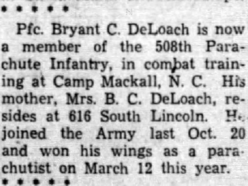 His mother, Mrs. B. C. DeLoach, resides at 616 South Lincoln. He joined the Army last Oct 20 and won his wings as a parachutist on March 12 this year.
