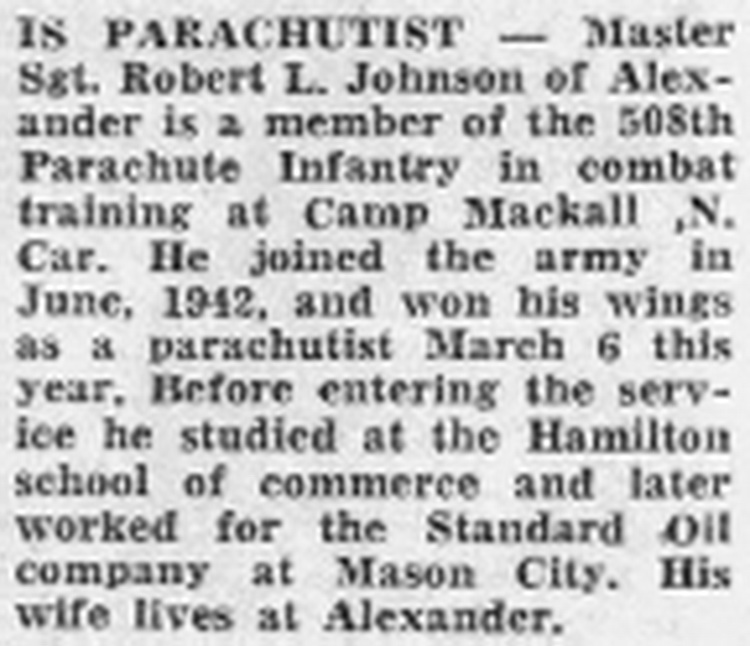 Master Sgt. Robert L. Johnson of Alexander is a member of the 508th Parachute Infantry in combat training: at Camp Mackall ,N, Car. He joined the army in June, 1942, and won his wings as a parachutist March 6 this year. Before entering: the service he studied at the Hamilton school of commerce and later worked for the Standard Oil company at Mason City. His wife lives at Alexander.
