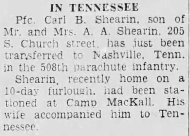just been transferred to Nashville, Tenn. in the 508th parachute infantry. Shearin. recently home on a 10-day furlough, had been stationed at Camp MacKall. His wife accompanied him to Tennessee.