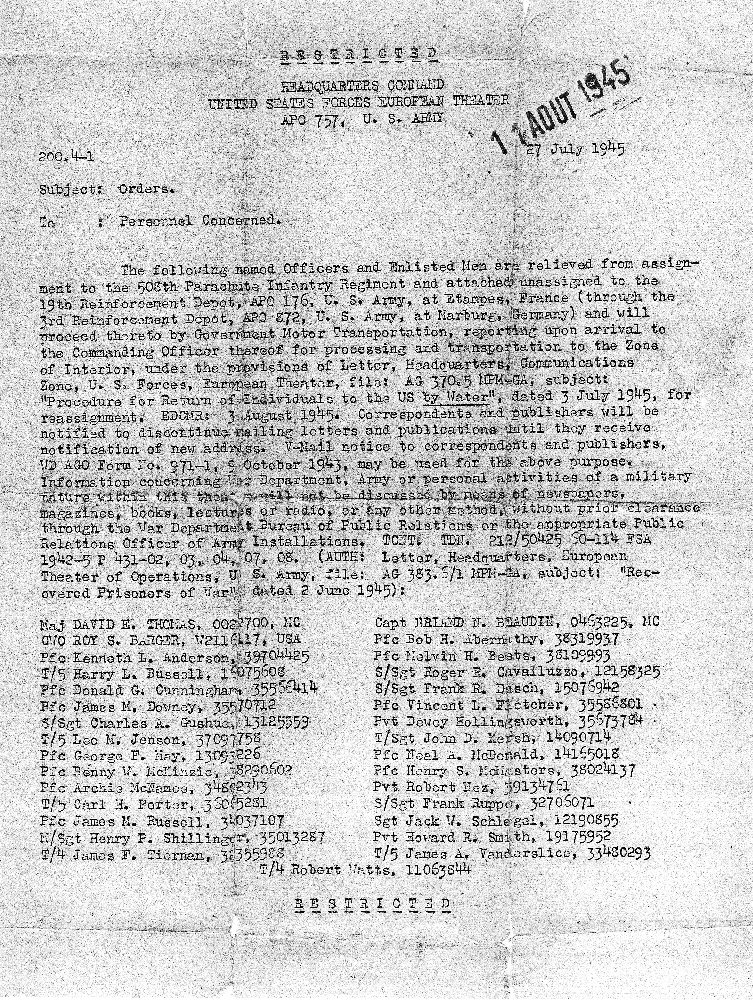 reassignment. EDCMR: 3 August 1945. Correspondents and