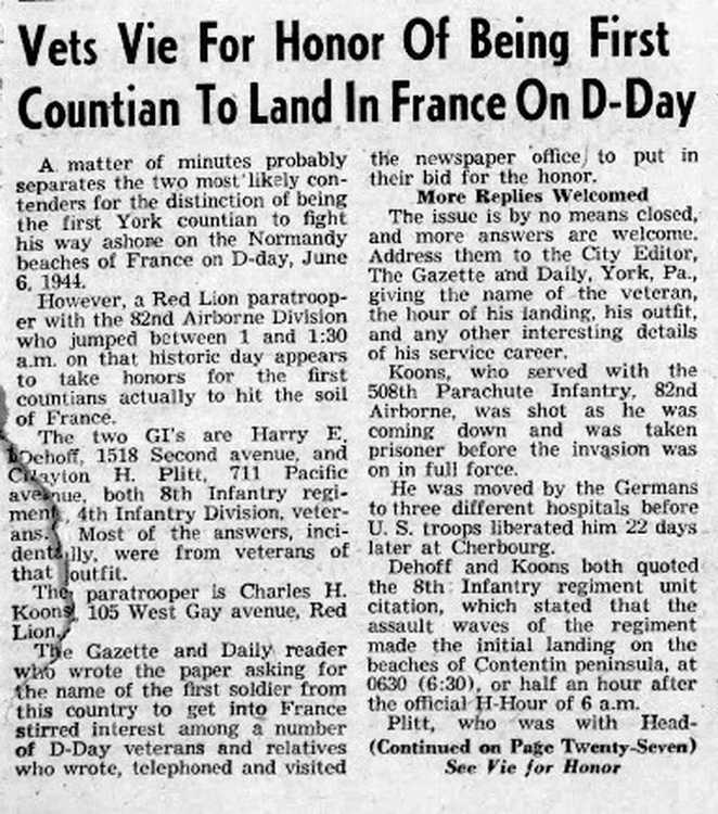 The paratrooper is Charles H. Koons, 105 West Gay avenue, Red Lion.