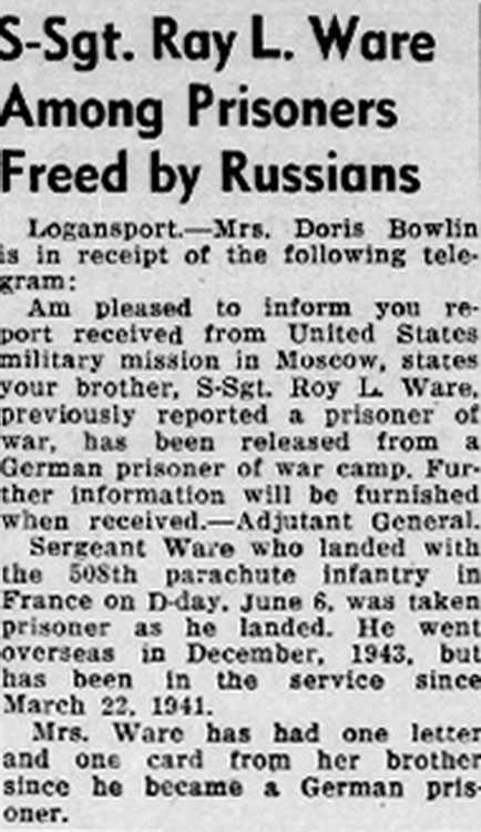Logansport —S-Sgt Ray L Ware a former prisoner of war in Germany, having been released by the Russians late in February arrived home on April 23 to spend a 60-day leave