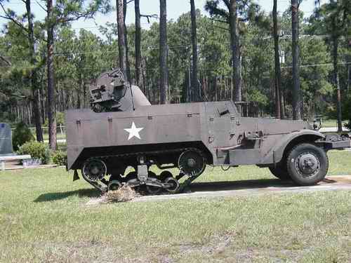 HALF-TRACK This model M16 (AA) version of the armored vehicle was for air defense and carried four .50 caliber machine guns on the rear pedestal. The gunner swiveled the pedestal with foot pedals while gun elevation was controlled by hand. |