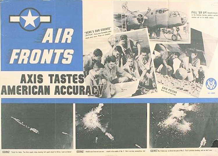Axis Tastes American Accuracy multi photo layout shows German ships being hit by aerial