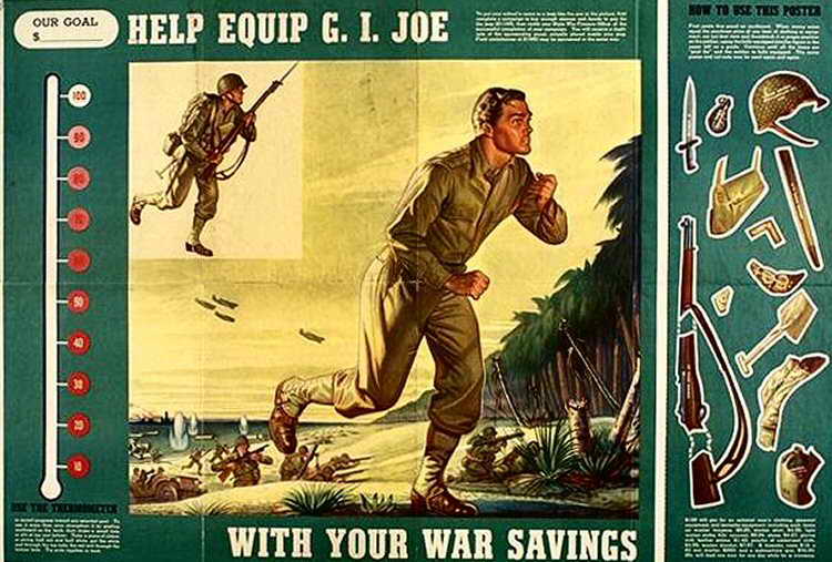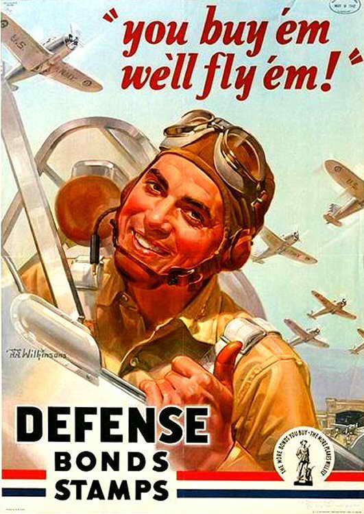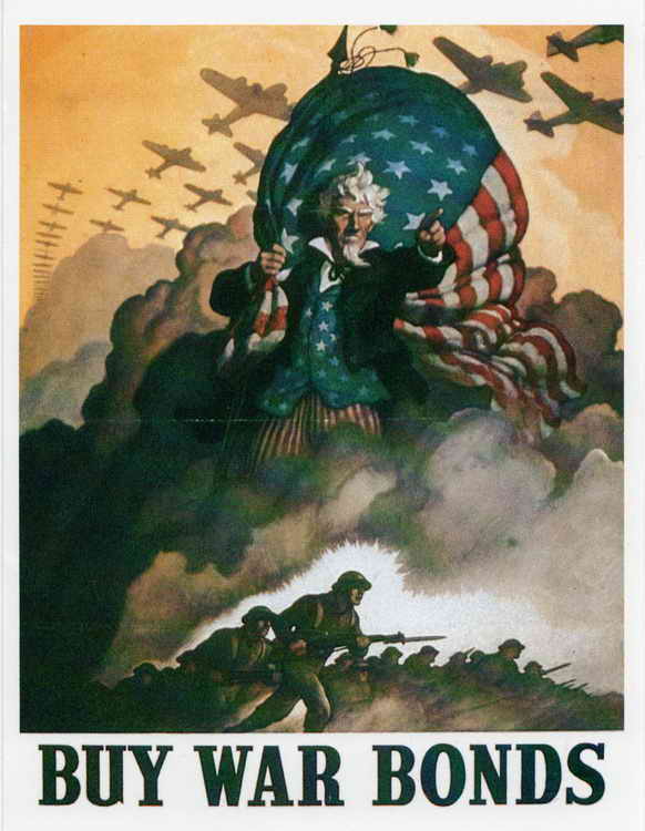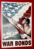 Buy Bonds was the theme of many posters that were printed in the WW-II era. The nation needed money to fight the war and the folks back home did their part by digging deep in their pockets to support the war effort in the only way that they could. |