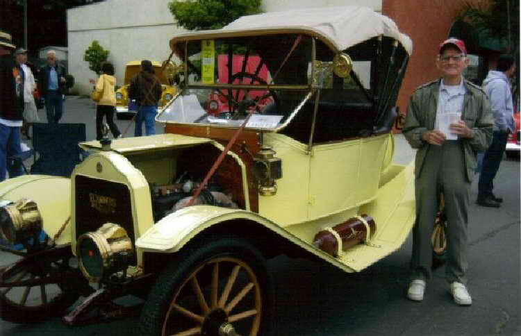 cranks up his antique auto, a 1912 Flanders roadster 30 which was