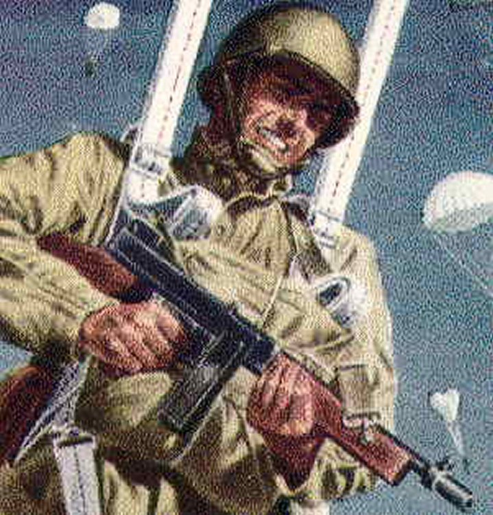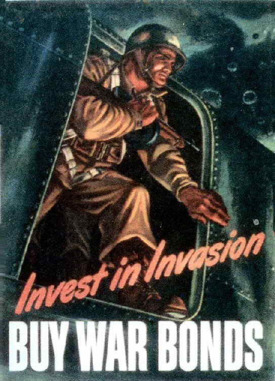 With the strengths instilled by the picture of a paratrooper landing on foreign soil, who could resist buying still another war bond? |