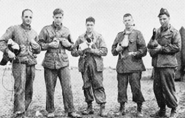 The March 1945 photo at right depicts Hq1 men and their “friends” in Sissonne, France. A few days later, the troopers tried to qualify their friends as parachutists. Sadly, the young dog experienced a canine malfunction. The birds took flight and probably lived happily ever after. All of the men in the picture are difficult to identify (after 60 years).