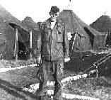 Warren Brown standing in the Hq1 tent area in Sissonne. Note the white painted rocks, evidence of the “beautification of the area” skills the Hq1 men learned in 1943 at Camp Mackall.