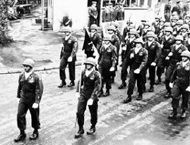 The photo shows Hq1 men marching to assume responsibility for security of the outer perimeter of the I. G. Farben building.