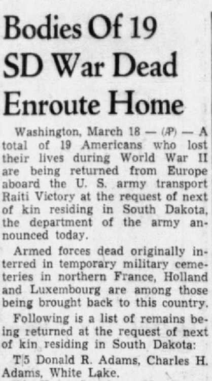 Washington, March 18 --- (AP) --- A total of 19 Americans who lost their lives during World War II are being returned from Europe aboard the U. S. army transport Raiti Victory at the request of next of kin residing in South Dakota, the department of the army announced today.