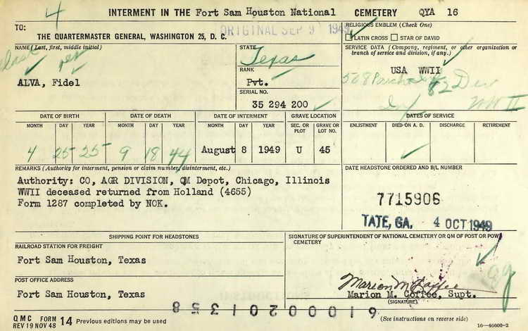 marker for Pvt. Felix Alva at Section U, Site 45 in