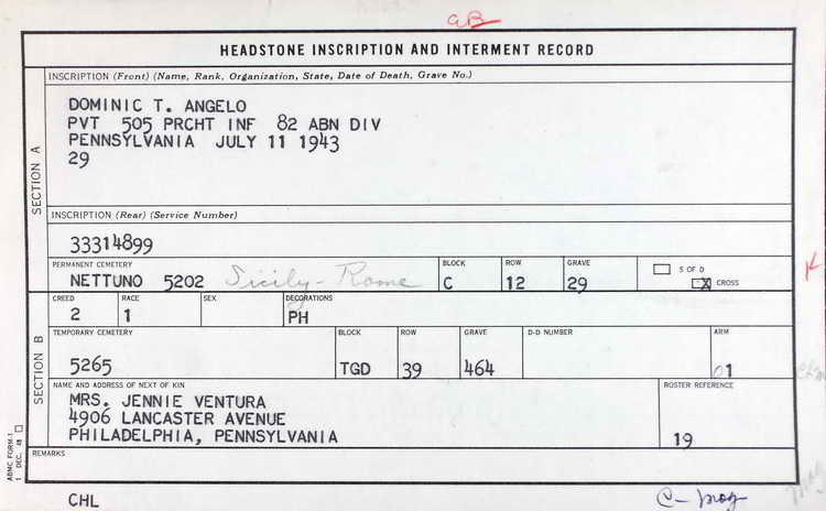 Interment Record for Pvt Dominic T. Angelo in Plot C, Row 12, Grave 29
