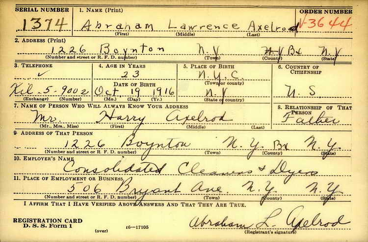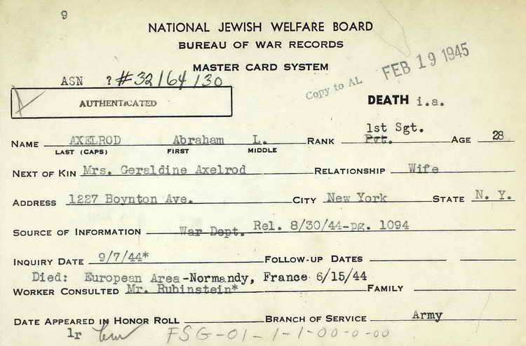 for the death of 1st Sgt Abraham L. Axelrod in France on 15 June 1944.