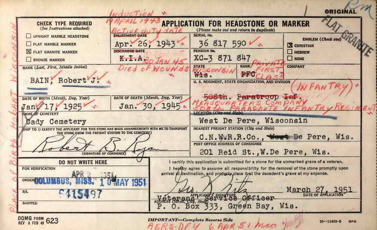 Application for headstone and grave markers for Pfc Robert J. Bain in