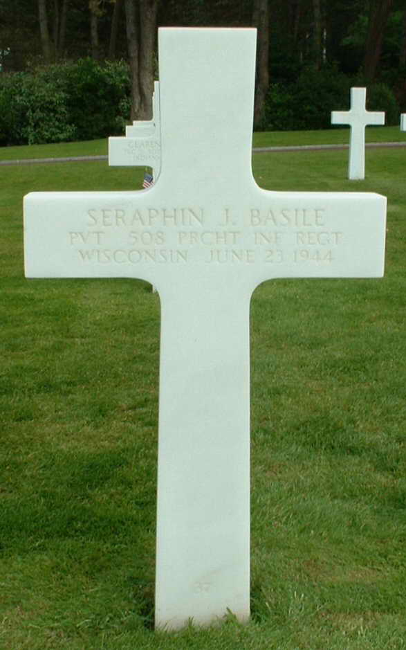 Grave marker for Pvt. Seraphin J. Basile at Plot B Row 4 Grave 37 in the Normandy American Cemetery and Memorial in Colleville-sur-Mer, France