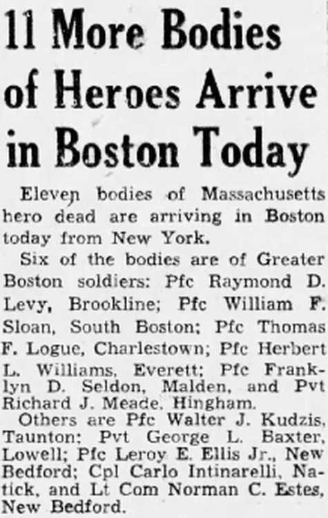 Six of the bodies are of Greater Boston soldiers: Pfc Raymond D. Levy,