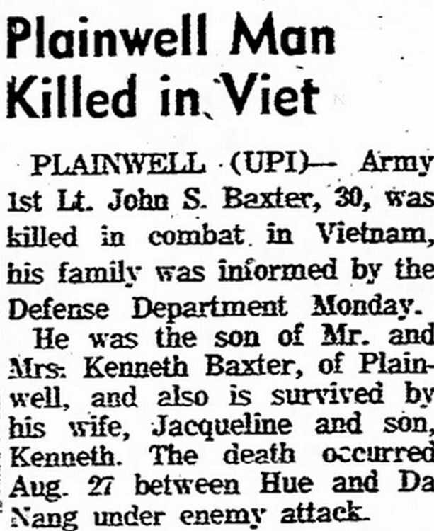 Lt. John S. Baxter, 30, was killed in combat in Vietnam, his family was informed by the