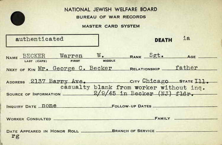 Sgt Becker died of wounds on September 27, 1944 and was awarded this Purple Heart. |