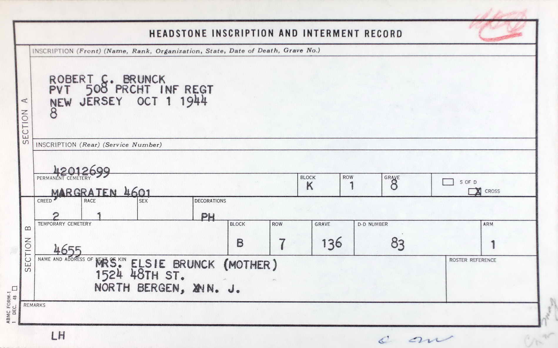 Headstone Inscription and Interment Record and grave marker for Pvt. Robert C. Brunck at Plot K Row 1 Grave 8 in Margraten American Cemetery, Holland.