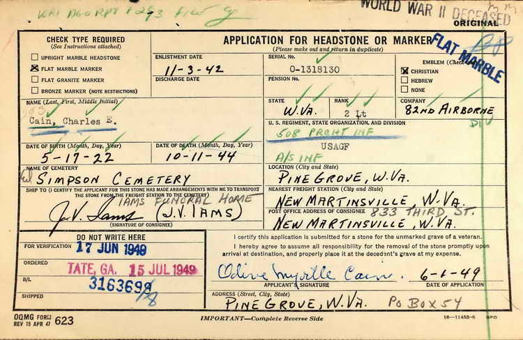 marker for 2nd Lt Charles E. Cain to be installed in the Pine Grove
