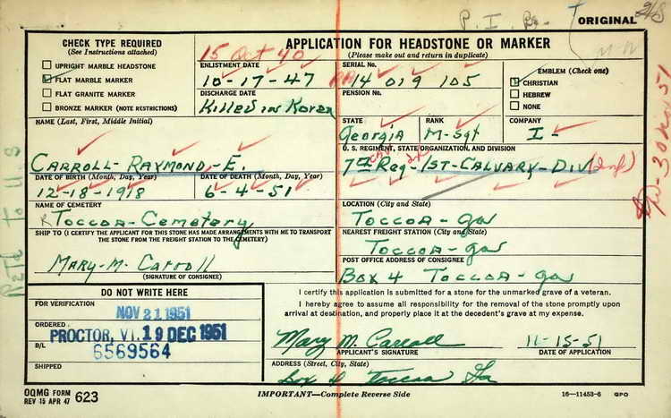 Application for Headstone or Marker for MSgt Raymond E.