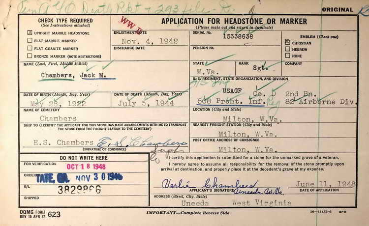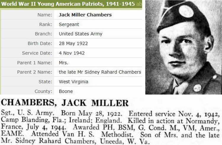 Sgt. Chambers died of wounds on July 5, 1944 and was awarded the Purple Heart. |