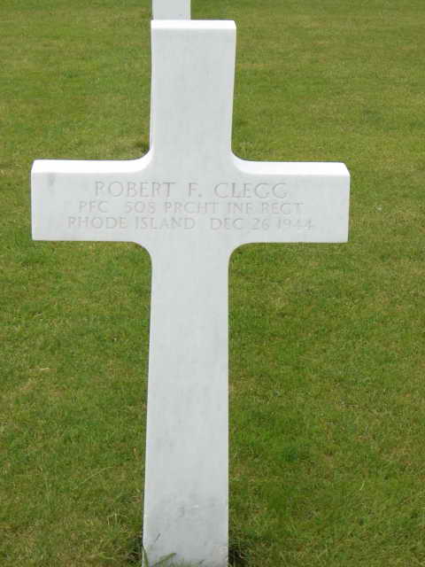Grave marker for Pfc Robert F. Clegg at Plot H Row 15 Grave 54 in Henri-Chapelle Cemetery, Belgium.