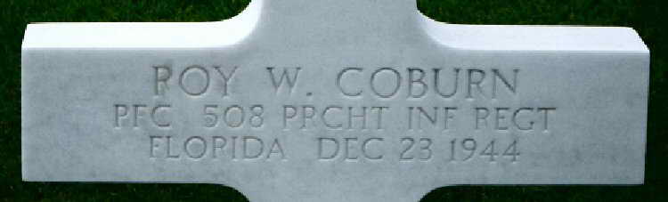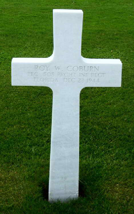 Grave marker for Pfc Roy W. Coburn at Plot F Row 1 Grave 19 in the Henri Chapelle American Cemetery, Belgium