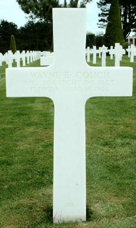 Grave marker for Pfc Wayne E. Couch at Plot D Row 14 Grave 20 in the Normandy American Cemetery and Memorial in Colleville-sur-Mer, France