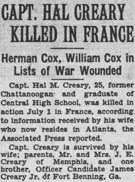 Capt. Hal M. Creary, 25, former Chattanoogan and graduate of Central High School, was killed in action July 1 in France, according to information received by his wife who now resides in Atlanta, the Associated Press reported.
