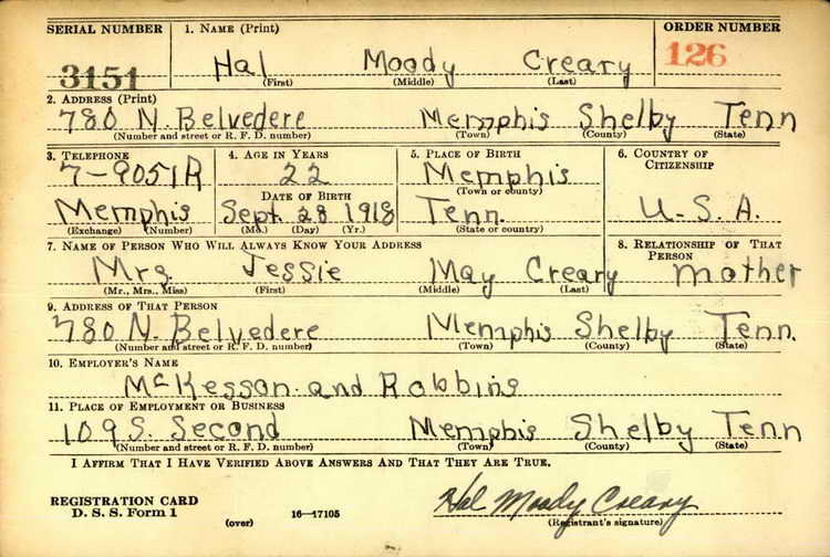 Capt Creary is survived by his wife; parents, Mr. and Mrs. J. E. Creary of Memphis,, and one brother, Officer Candidate James Creary Jr. 5f Fort Benning, Ga.