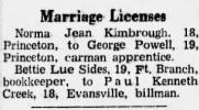 Norma Jean Kimbrough. 18, Princeton, to George Powell, 19,